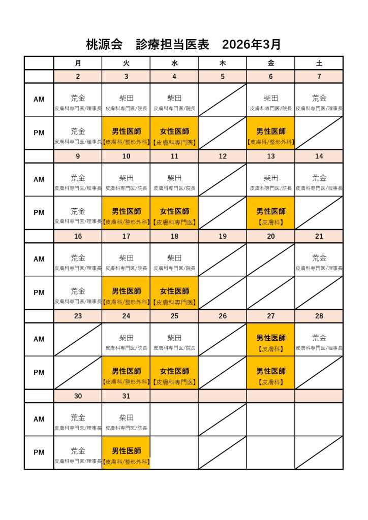 | 午前診 | 10:00~13:00 | 荒金 皮膚科専門医 | 柴田 皮膚科専門医 | 柴田 皮膚科専門医 | 休診 | 柴田 皮膚科専門医 | 荒金 皮膚科専門医 |